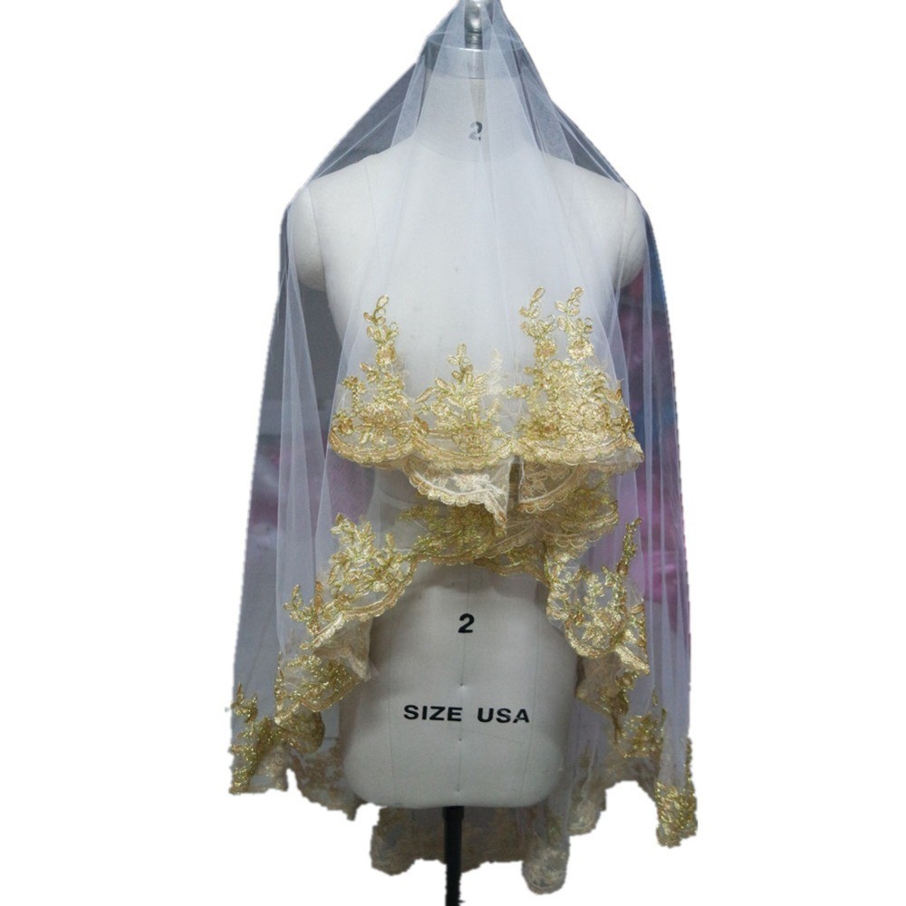 Wedding Veils With Gold Lace Appliques Whitetulle Bridal Veil