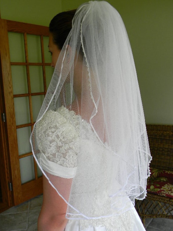 Bridal Veil Elbow Length Ribbon Edge W Beading Etsy