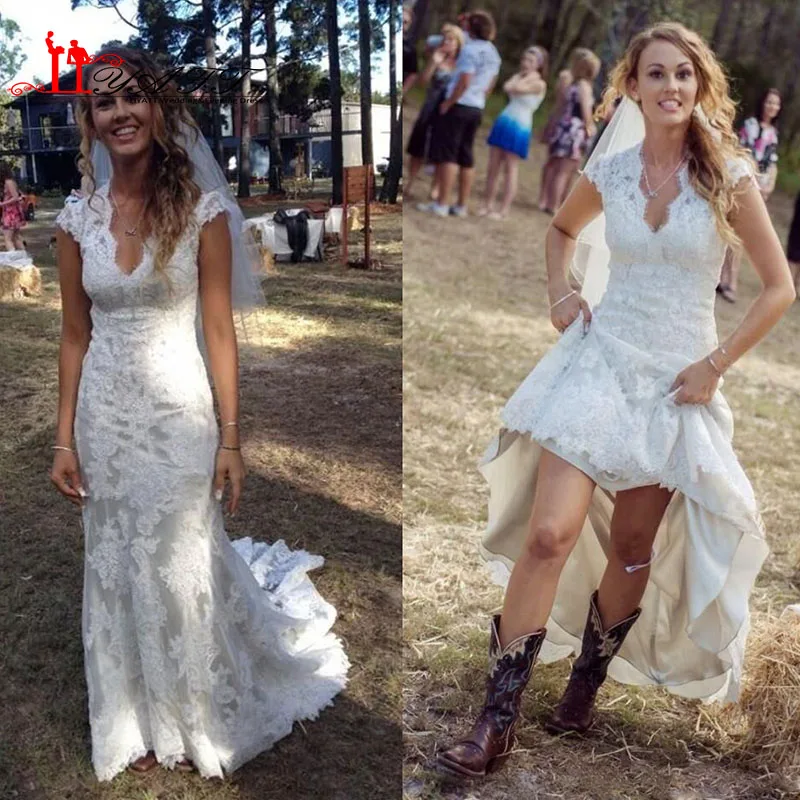 Vintage Lace Country Wedding Dresses For Bride A Line V Neck High