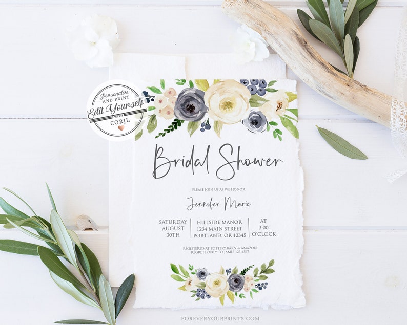 Blue Floral Bridal Shower Invitation Printable Wedding Shower