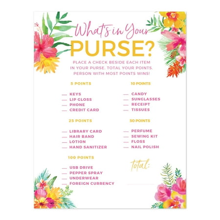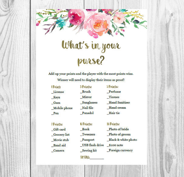 Wedding shower purse game. A very simple and funny game this version gives you a ton more items for your guests to find in their purse and get points on. Before the bridal shower create a list of standard items you might have in your pursestart with the basics lip gloss credit cards keys and work your way up to more random or risque objects condoms dog treatsyoull also need to buy a few little gifts to be given out as prizes. Its like a scavenger hunt using each guests purse or bag.